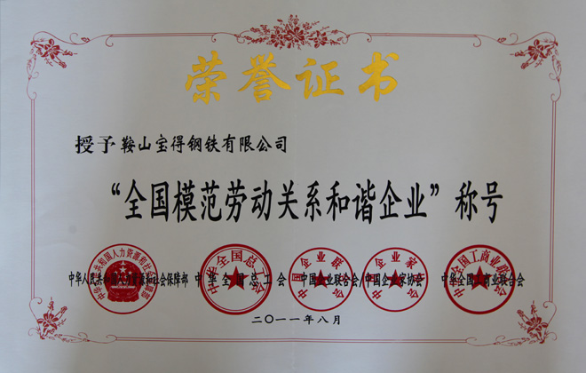 2011年8月15日,在北京召開的全國構建和諧勞動關系先進表彰暨經驗交流會上,公司被國家人力資源和社會保障部、中華全國總工會、中國企業聯合會、中國企業家協會、中華全國工商業聯合會表彰,并授予“全國模范勞動關系和諧企業”稱號。鞍山市僅寶得公司一家企業獲此殊榮。