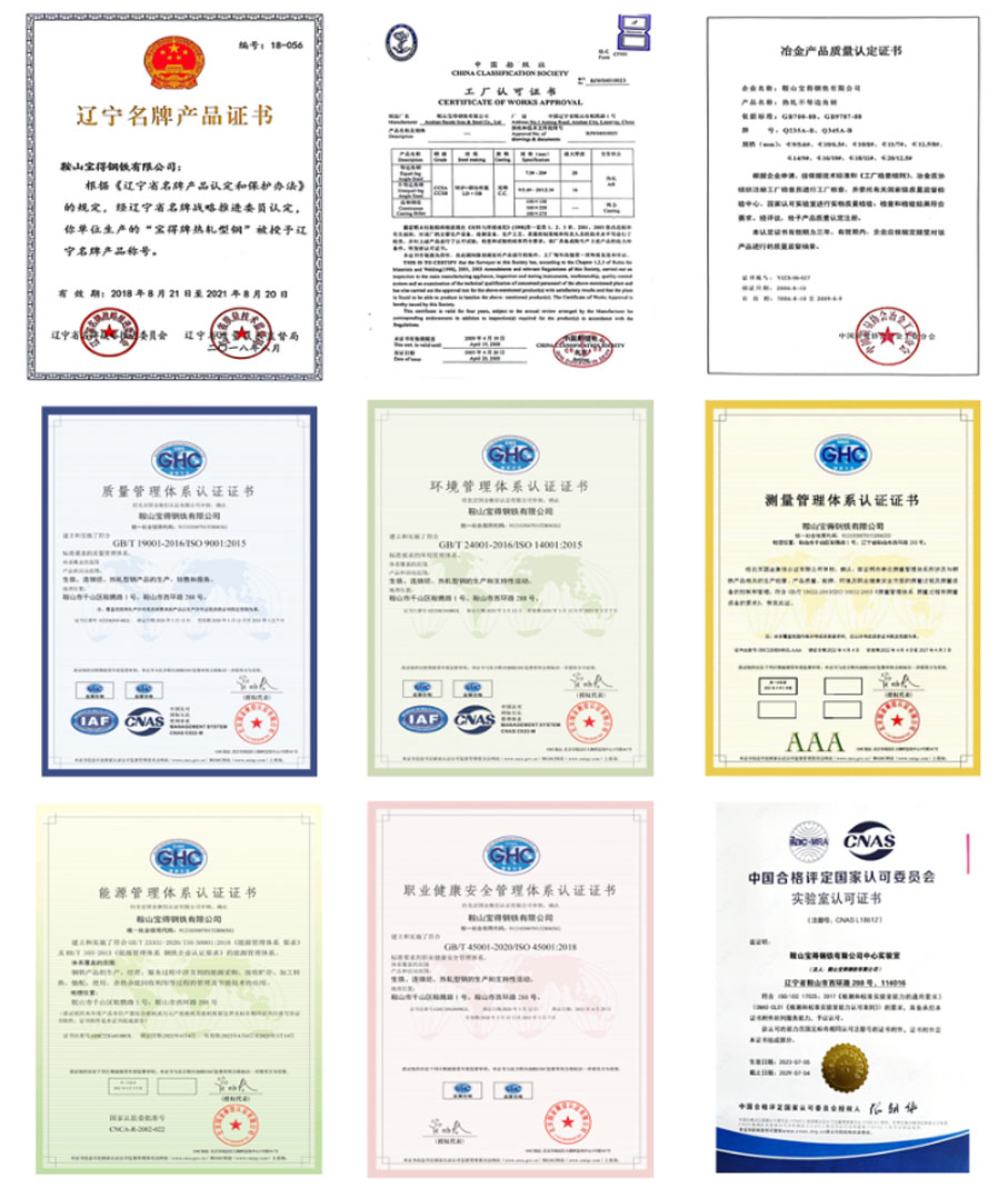 “寶得”牌鋼材以科學的管理,先進的裝備,嚴格的檢測為保障,產品外型尺寸精度高,成分穩定,性能可靠,表面質量好,實物質量高于國家標準,達到發達國家同類產品水平,屢獲國家“冶金產品實物質量金杯獎” 和“遼寧省名牌產品”稱號。公司通過了GB/T 19001/ISO 9001質量管理體系、GB/T 24001/ ISO 14001環境管理體系、GB/T 45001/ISO 45001職業健康安全管理體系、GB/T 23331 / ISO 50001和RB/T 103能源管理體系、GB/T 19022/ISO 10012測量管理體系審核認證,獲得方圓標志認證中心頒發的“管理創新獎”,取得國家船級社(CCS)的生產工廠認可證書和遼寧省進出口檢驗檢疫局頒發的“產品出口免檢認可證書”。